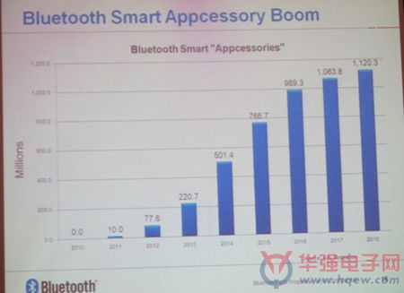 基于蓝牙4.0 技术的蓝牙智能应用配件的增长态势将非常可观。数据预测,2013年搭载蓝牙4.0的配件出货量将达2.2亿部,2014年达5亿部,2018年则超过11亿部。2013-2014年将是蓝牙4.0增速最快的阶段。
