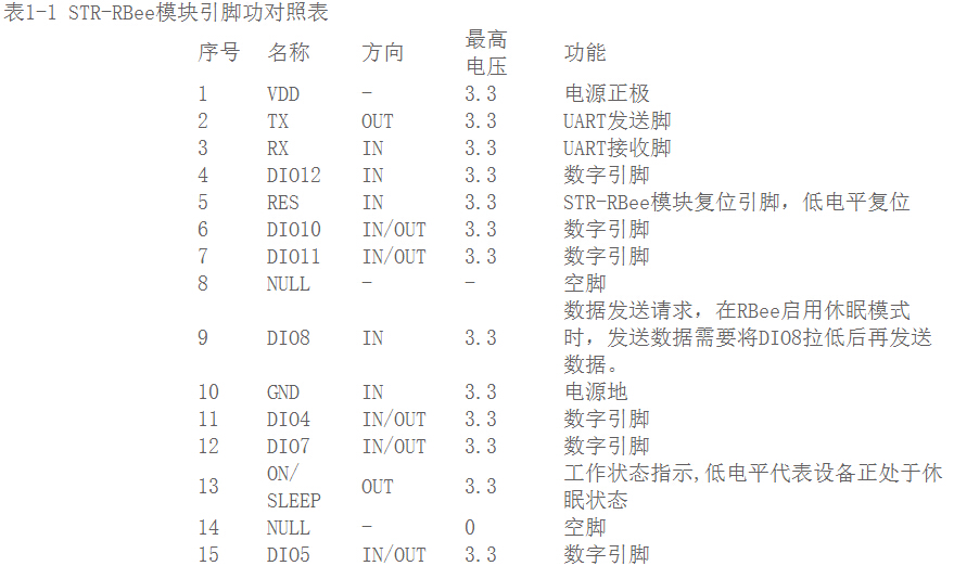 STR-RBee-3338A模块引出20个引脚, 其中电源2个,空脚2个,复位1个,串口2个,IO接口12个。接口排布的正面视图如1-1。各引脚的功能见表1-1。