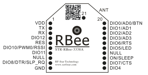 STR-RBee-3338A模块引出20个引脚, 其中电源2个,空脚2个,复位1个,串口2个,IO接口12个。接口排布的正面视图如1-1。各引脚的功能见表1-1。
