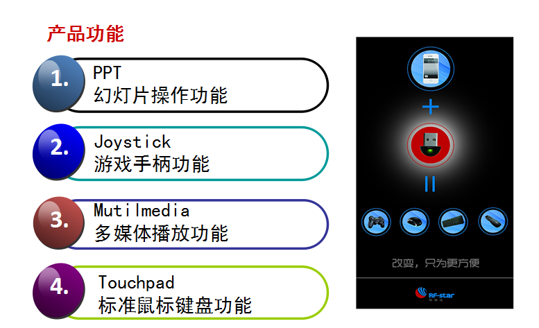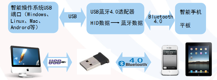 使用时,只需将RF-BLEUD插入带USB接口的PC或Smart TV,与搭载蓝牙4.0功能的移动终端连接,移动终端即可充当PPT控制器、虚拟鼠标键盘、游戏手柄、电视遥控器、影音控制器等HID设备。 产品使用示意图如下: